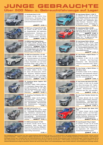 81. KGM Korando Spezial 1.5T GDIEZ: 06/2025, 120 kW / 163 PS, 100 km,Lederlenkrad, Allrad, Privacy Glass,Berganfahrhilfe, Dachreling, M%u00fcdigkeitserkennung, Frontkollisionswarner, Klima,Apple CarPlay/ Android Auto23.490,- %u20ac82. Jeep Avenger Altitude 1.2 GSE T3EZ: 09/2023, 74 kW / 101 PS, 18.490km, Einparkhilfe hinten, Klimaautomatik,Winter-Paket, Sitzheizung vorn, StartStop-Knopf, LED- Scheinwerfer, Bergabfahr-Assistent, Tempomat, Au%u00dfenspiegel elektr. verstell- und heizbar, beide, Auffahrwarnsystem 19.990,- %u20ac83. Jeep Avenger Elektro 54 kWhEZ: 03/2025, 115 kW / 156 PS, 15 km,Reichweite 400 km komb., Bergabfahrhilfe, Vorklimatisierung des Innenraums,Klima, 38.190,- %u20ac 25.990,- %u20acKombinierte Werte f%u00fcr den Jeep%u00ae Avenger Elektro gem. WLTP: Energieverbrauch 15,5 - 16 kWh/100 km; CO2-Emission 0 g/km; CO2-Klasse: A84. Jeep Avenger Elektro AltitudeEZ: 07/2023, 115 kW / 156 PS, 18.490km, Reichweite 400 km komb., R%u00fcckfahrkamera, Sitzheizung, Klimaautomatik, Geschwindigkeitsregelanlage, Uconnect Display mit Multitouch-Funktion,Au%u00dfenspiegel beheizbar45.030,- %u20ac 25.990,- %u20ac86. Jeep Avenger e-Hybrid Altitude 1.248V Winter-PaketEZ: 04/2024, 74 kW / 101 PS, 17.900 km,Automatik, LED-Scheinwerfer, Klimaautomatik, Mittelarmlehne vorn mit Staufach, Sitz- und Lenkradheizung36.490,- %u20ac 25.990,- %u20ac88. Jeep Grand Cherokee Overland 4xe2023EZ: 01/2024, 280 kW / 381 PS, 13.500km, Allrad, Lenkrad heizbar, PanoramaGlasschiebedach, Spurhalteassistent,Totwinkelassistent, Sport Mode, R%u00fcckfahrkamera, Navi, Sitz- und Lenkradheizung 94.770,- %u20ac 74.990,- %u20ac87. Jeep Compass High Upland 2023 PHEVEZ: 11/2023, 177 kW / 241 PS, 28.000km, Allrad, Alarmanlage, LED- Tagfahrlicht, Verglasung get%u00f6nt und hinten abgedunkelt, Klimaautomatik 2-Zonen,Tempomat, Navi, Sitz- und Lenkradheizung 57.260,- %u20ac 35.990,- %u20ac90. Jeep Renegade S Plug-In-HybridEZ: 07/2023, 177 kW / 241 PS, 26.400km, Panoramadach vorn elektrisch, hinten fest, Winter-Paket, Verglasung hinten abgedunkelt, LED- Scheinwerfer,Allradantrieb, Navigationssystem50.750,- %u20ac 28.990,- %u20ac73. Fiat Ducato Serie 2 L2 H2EZ: 02/2025, 103 kW / 140 PS, 15 km,R%u00fcckfahrkamera, Klimaanlage, Bremsassistent, Einparkhilfe elektronisch, PDC,Laderaumtrennwand mit Fenster47.683,- %u20ac 30.990,- %u20ac74. KGM Torres 1.5T Spezial Plus MT 2WDEZ: 12/2024, 120 kW / 163 PS, 10.900km, Berganfahrhilfe, LED-Tagfahrlicht,Totwinkelassistent, Sitzheizung vorn,R%u00fcckfahrkamera, 2-Zonen-Klimaautomatik, Fernlichtassistent, %u00dcberschlagschutz 27.180,- %u20ac 22.990,- %u20ac89. Jeep Renegade High Upland 2023PHEVEZ: 11/2023, 176 kW / 239 PS, 22.900km, Winter- Konfort- und Sicht Paket,Navigationssystem, Lenkrad mit Multifunktion, Dachreling, Allradantrieb, Au%u00dfenspiegel mit Totwinkel-Assistent49.150,- %u20ac 289.990,- %u20ac75. KGM Korando E-Motion BronzeEZ: 01/2025, 140 kW / 190 PS, 200 km,Klima, Freisprecheinr. Bluetooth, Bremsass., Audiobedienung am Lenkrad, Abstandswarner 44.280,- %u20ac 20.990,- %u20acKombinierte Werte f%u00fcr den Fiat 500e Action 23,8kWh Elektro gem. WLTP: Energieverbrauch 13,0 kWh/100 km; CO2-Emission 0 g/km; CO2-Klasse: A76. KGM Torres Spezial Plus 1.5T-GDIEZ: 12/2024, 120 kW / 163 PS, 19.500km, Zentralverriegelung mit Fernbedienung, R%u00fcckfahrkamera, Klimaautomatik2-Zonen, Einparkhilfe vorn und hinten,Start/Stop-Anlage, Apple CarPlay/ Android Auto 31.680,- %u20ac 25.990,- %u20ac77. SsangYong Torres Spezial Plus 1.5T ATEZ:11/2024, 120kW / 163 PS, 21.500km, Allrad, LED-Scheinwerfer, LM-Felgen, Tempomat, Notbrems-Assistent,Einparkhilfe vo./hi., Licht- und Regensensor, R%u00fcckfahrkamera, Apple CarPlay/Android Auto 33.680,- %u20ac 26.990,- %u20ac78. SsangYong Rexton Sapphire 20232.2D 8AT AWDEZ:01/2024, 149kW / 203PS, 29.000 km,3,5 t Anh%u00e4ngelast, Elegance-Paket, Nappa-Leder-Ausstattung, 20%u201c LM Felgen,360%u00b0-3D-Kamerasystem, Licht- und Regensonsor, Sitz- / Lenkradhzg, Sitzbel.,Untersetzer 65.280,- %u20ac 45.990,- %u20ac79. SsangYong Tivoli Blackline 2024 1.5AutomatikEZ:03/2024, 120kW / 163 PS, 9.490 km,LED-Scheinwerfer, Tempomat, Verkehrszeichenerkennung, Fernlichtassistent, Getr%u00e4nkehalter, Klimaautomatik,Navi, R%u00fcckfahrkamera, Lederausstattung, Sitzheizung 23.990,- %u20ac80. KGM Tivoli Grand Fizz 1.5EZ: 01/2024, 120 kW / 163 PS, 15.000km, Innenspiegel automatisch abblendend, Beheizbares Lederlenkrad, Einparkhilfe vorn und hinten, Geschwindigkeitsregelanlage, Spurhalteassistent,Klimaanlage, Bluetooth%u00ae-Freisprecheinrichtung 30.680,- %u20ac 18.990,- %u20ac85. Jeep Avenger e-Hybrid Altitude 1.248V Winter-PaketEZ: 06/2024, 75 kW / 101 PS, 12.700km, Automatik, Start-Stop-Knopf,Scheinwerfer LED, Klimaautomatik,Tempomat, Einparkhilfe hinten, Sitzheizung 25.890,- %u20acJUNGE GEBRAUCHTE%u00dcber 500 Neu- u. Gebrauchtfahrzeuge auf LagerDie angegebenen Werte wurden nach dem vorgeschriebenen Messverfahren (%u00a7 2 Nrn. 5, 6, 6a Pkw-EnVKV in der jeweils geltenden Fassung) ermittelt. Irrt%u00fcmer und Vorverkauf vorbehalten %u2013 *MwSt. ausweisbar! Weitere Informationen zum offiziellen Kraftstoffverbrauch und den offiziellen spezifischen CO2-Emissionen neuer Personenkraftwagen k%u00f6nnen dem %u201eLeitfaden %u00fcber den Kraftstoffverbrauch, die CO2-Emissionen und den Stromverbrauch neuer Personenkraftwagen%u201c entnommen werden, der anallen Verkaufsstellen und bei der DAT Deutsche Automobil Treuhand GmbH, Hellmuth-Hirth-Stra%u00dfe 1, 73760 Ostfildern (www.dat.de), unentgeltlich erh%u00e4ltlich ist. Die tats%u00e4chliche Reichweite kann aufgrund zahlreicher Faktoren wie Fahrstil, Route, Wetter und Stra%u00dfenbedingungen sowie Zustand, Gebrauch, und Ausstattung des Fahrzeugs variieren.