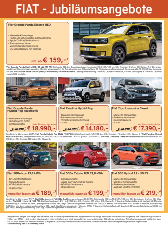 FIAT - Jubil%u00e4umsangeboteFiat Grande PandaHybrid Pop Automatik- Manuelle Klimaanlage- Parksensoren hinten- Lichtautomatik%u20ac 21.190,- %u20ac 18.990,%u2013Fiat Tipo Limousine Diesel- Manuelle Klimaanlage- Parksensoren hinten- R%u00fcckfahrkamera- u.v.m.%u20ac 21.190,- %u20ac 17.390,%u2013Fiat Pandina Hybrid Pop- Manuelle Klimaanlage- Parksensoren hinten- Verkehrszeichenerkennung- u.v.m.%u20ac 17.680,- %u20ac 14.180,%u2013Fiat Grande Panda Elektro RED- Manuelle Klimaanlage- Pixel LED-Scheinwerfer, Lichtautomatik- Apple CarPlay/Andriod Auto- Parksensoren hinten- Verkehrszeichenerkennung- DC Schnellladung mit 100 kWmtl. ab%u20ac 159,%u20131Fiat 500e Icon 23,8 kWh- 16%u201c Leichtmetallfelgen- Klimaautomatik- HD-R%u00fcckfahrkamera- Regensensormonatlich leasen ab %u20ac 189,-2Fiat 600 Hybrid 1.2 - 110 PS- Manuelle Klimaanlage- Voll-LED-Scheinwerfer- Parksensoren hinten- auch als Elektro erh%u00e4ltlichmonatlich leasen ab %u20ac 219,-4Fiat 500e Cabrio RED 23,8 kWh- Klimaautomatik- Apple CarPlay/ Android Autom.- HD-R%u00fcckfahrkamera- Regensensormonatlich leasen ab %u20ac 199,-3Kombinierte Werte gem. WLTP: Fiat Panda Hybrid Pop 81kW (110 PS) Kraftstoffverbrauch: 5,1 l/100 km; CO2-Emission: 116 g/km; CO2-Klasse: D. / Fiat Pandina HybridPop 51kW (70 PS) Energieverbrauch 5,1 - 5,0 l/100 km; CO2-Emissionen 116 - 113 g/km; CO2-Klasse: D./ Fiat Tipo Limousine Diesel 96kW (130PS) Kraftstoffverbrauch 4,6l/100 km; CO2-Emission 120 g/km;CO2-Klasse: D.*Fiat Grande Panda Elektro RED, 83 kW (113 PS) Reichweite 320 km, Energieverbrauch kombiniert 16,8 kWh/100 km; CO2-Emission 0 g/km; CO2-Klasse: A. / 1Ein unverbindliches Kilometerleasingangebot (Bonit%u00e4t vorausgesetzt) f%u00fcr Privatkunden der Stellantis Bank SA Niederlassung;Deutschland, Siemensstra%u00dfe 10, 63263 Neu-Isenburg,f%u00fcr den Fiat Grande Panda Elektro (RED), Elektromotor, 44-kWh-Batterie: Leasingsonderzahlung 159,00 %u20ac, Laufzeit 48 Monate, 48%u00d7 mtl. Leasingrate %u00e0 159,00 %u20ac, Laufleistung 5.000 km/Jahr.inkl. Eintauschpr%u00e4mie inkl. Eintauschpr%u00e4mie inkl. Eintauschpr%u00e4mieBeispielfotos zeigen Fahrzeuge der Baureihe, die Ausstattungsmerkmale der abgebildeten Fahrzeuge sind nicht Bestandteil des Angebots. Die %u00dcberf%u00fchrungskosten inH%u00f6he von 1.190,-- sind in den Leasingraten nicht enthalten und sind gesondert an den anbietenden H%u00e4ndler zu entrichten. Privatkundenangebot, g%u00fcltig bis zum05.10.2025. Mehr- und Minderkilometer (Freigrenze 2.500 km) sowie eventuell vorhandene Sch%u00e4den werden nach Vertragsende gesondert abgerechnet.Eine Werbung der FCA Germany GmHKombinierte Werte gem. WLTP: Fiat 500e Icon und Fiat 500e Red Energieverbrauch 23,8 kWH: Reichweite 190 km: 13,0 kWh/100 km; CO2-Emissionen 0 g/km; CO2-Klasse: A. / Fiat 600 Hybrid 1.2 (100 PS): Kraftstoffverbrauch 4,9 %u2013 4,8 l/100 km; CO2-Emission 109 g/km; CO2-Klasse: C.; / 2Leasing: Stellantis Bank AG, Laufzeit 48 Monate,Fahrleistung 5.000 km pro Jahr, Leasingsonderzahlung 189,- zzgl. %u00dcberf%u00fchrungskosten in H%u00f6he von 1.190,-/ 3Leasing: Stellantis Bank AG, Laufzeit 48 Monate, Fahrleistung5.000 km pro Jahr, Leasingsonderzahlung 199,- zzgl. %u00dcberf%u00fchrungskosten in H%u00f6he von 1.190,-/ 4Leasing: Stellantis Bank AG, Laufzeit 48 Monate, Fahrleistung 5.000 kmpro Jahr, Leasingsonderzahlung 219,- zzgl. %u00dcberf%u00fchrungskosten in H%u00f6he von 1.190,-