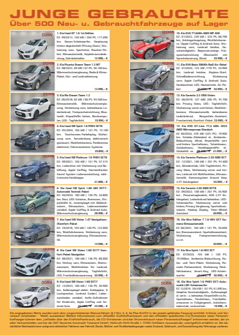 9. Kia Ceed SW Vision 1.6D DCT7EZ: 12/2023, 100 kW / 136 PS, 36.900km, Au%u00dfenspiegel elektr. Anklappbar, 6Lautsprecher, Lenkrad (Leder), Laderaumboden variabel, Isofix-Aufnahmenf%u00fcr Kindersitz, Apple CarPlay und Android Auto 33.280,- %u20ac 23.990,- %u20ac10. Kia EV6 77.4kWh AWD WP AHKEZ: 01/2022, 239 kW / 325 PS, 68.790km, Anh%u00e4ngerkupplung, R%u00fcckfahrkamera, (Apple CarPlay & Android Auto, Sitzheizung vorn, Lenkrad heizbar, Geschwindigkeits- Begrenzeranlage, Freisprecheinrichtung (Bluetooth) mitSprachsteuerung, Allrad 35.990,- %u20ac11. Kia EV6 Basis 58kWh RwD Air-PaketEZ: 01/2024, 125 kW /170 PS, 24.900km, Lenkrad heizbar, Keyless-Start,Schnellladevorrichtung, Sitzheizungvorn, Apple CarPlay & Android Auto,Heckleuchten LED, Heckantrieb, Air-Paket 52.930,- %u20ac 34.990,- %u20ac12. Kia Sorento 2.2 CRDi VisionEZ: 06/2019, 147 kW/ 200 PS, 91.700km, Privacy Glass, LED- Tagfahrlicht,Sitzheizung vorne und hinten, R%u00fcckfahrkamera, Klimaautomatik, beheizbaresLederlenkrad, Berganfahr-Assistent,Frontantrieb, Komfort-Paket 23.990,- %u20ac14. Kia Sorento Platinum 2.2D AWD DCTEZ: 12/2021, 148 kW / 201 PS, 91.600km, Allradantrieb, LED-Tagfahrlicht, Privacy Glass, Sitzheizung vorne und hinten, Lenkrad mit Multifunktion, Klimaautomatik, Kamerasystem Around View,2,5T Anh%u00e4ngelast 33.990 ,- %u20ac16. Kia Niro Edition 7 1.6 HEV DCT Kamera KlimaautomatikEZ 06/2021, 104 kW / 141 PS, 50.600km, Bremsassistent, Spurhalteassistent,Sitzheizung, Freisprecheinrichtung,u.v.m.20.990 ,- %u20ac15. Kia Sorento 2.2D AWD DCT8EZ: 09/2022, 148 kW / 201 PS, 45.900km , Panoramaglasdach, AHK 2,5T Anh%u00e4ngelast, Lederlenkrad beheizbar, LEDScheinwerfer, Sitzheizung vorne undhinten, Privacy Verglasung, Spurhalteassistent, Headup Display, Toter-WinkelAssistent 40.990 ,- %u20ac18. Kia Niro Spirit 1.6 PHEV DCT-Automatik LED-ScheinwerferEZ 12/2019, 104 KW / 141 PS, 61.490 km,Adaptive Geschwindigkeits., Au%u00dfenspiegelel. verst.- u. beheizbar, Einparkhilfe vo./hi.,Spurhalteass., Fernlichtass., Frontkollisionswarner m. Fu%u00dfg%u00e4ngererk., Induktionsladeschale, Lenkrad beh. 19.990,- %u20ac1. Kia Ceed GT 1.6 1st EditionEZ: 09/2013, 150 kW / 204 PS, 117.490km, Xenon-Scheinwerfer, Verglasunghinten abgedunkelt (Privacy Glass), Sitzheizung vorn, Sportsitze, Raucher-Paket, Klimaautomatik, Gep%u00e4ckraumabdeckung, Getr%u00e4nkehalter 12.990,- %u20ac2. Kia Picanto Dream Team 1.2 MTEZ: 08/2022, 49 kW / 67 PS, 30.100 km,W%u00e4rmeschutzverglasung, Radio & KlimaPaket, Sitz- und Lenkradheizung12.990,- %u20ac17. Kia Niro Spirit 1.6 HEV DCTEZ: 07/2024, 103 kW / 140 PS,19.500km, Ambiente-Beleuchtung, Relax- und Tech-Paket, Sitzheizung, Remote Parkassistent, Sitzheizung, R%u00fcckfahrkamera, Smart-Key, LED-Scheinwerfer 42.625,- %u20ac 30.990,- %u20ac3. Kia Rio Dream Team 1.2EZ: 06/2018, 62 kW / 84 PS, 93.500 km,Klimaautomatik, W%u00e4rmeschutzverglasung, Sitzheizung vorn, beheizbares Lederlenkrad, Freisprecheinrichtung Bluetooth, Einparkhilfe hinten, Bordcomputer, LED- Tagfahrlicht 10.990,- %u20ac4. Kia Ceed SW Spirit 1.6 PHEV DCT6EZ: 05/2024, 104 kW / 141 PS, 15.100km, Touchscreen-Farbdisplay, Sitzheizung vorn, Servolenkung elektronischgesteuert, R%u00fcckfahrkamera, Parkbremseelektrisch, Fahrerassistenz-Systeme25.890,- %u20ac5. Kia Ceed SW Platinum 1.6 PHEV DCT6EZ: 09/2021, 104 kW / 141 PS, 57.315km, Ledersitze mit Sitzheizung und Bel%u00fcftung, Apple CarPlay, HarmonKardonSound System Lederausstattung, elektronische Heckklappe21.890,- %u20ac6. Kia Ceed SW Spirit 1.6D 48V DCT7-Automatik Technik-PaketEZ: 04/2024, 100 kW / 136 PS, 24.800km, Navi, LED-Scheinw., Bremsass., Einparkhilfe hi., Innenspiegel mit Abblendautom., Klimaautom., Laderaumbodenvariabel, Apple CarPlay & Android Auto,W%u00e4rmeschutzverglasung 28.990,- %u20ac7. Kia Ceed SW Vision 1.4T Navigations-/Komfort-PaketEZ: 10/2018, 103 kW / 140 PS, 122.000km, R%u00fcckfahrkamera, Sitzheizung vorn,W%u00e4rmeschutzverglasung, Klimaautomatik13.990,- %u20ac8. Kia Ceed SW Vision 1.6D DCT7 Komfort-Paket NavigationEZ: 08/2021, 100 kW / 136 PS, 80.000km, Sitzhzg. vorn, Klimaautom., Bremsassistent, Multifunktion f%u00fcr Lenkrad,W%u00e4rmeschutzverglasung, Tagfahrlicht,LED, Frontkollisionswarnung 20.990,- %u20ac13. Kia EV6 GT-Line 77,4 kWh 2023AWD W%u00e4rmepumpe GlasdachEZ 06/2024, 239 kW (325 PS), 19.900km, Schiebe-/Hebedach el., AmbienteBeleuchtung, Allrad, Einparkhilfe vornund hinten, Spurhalteass,, Totwinkeass.,Autobahnass., Heckklappen%u00f6ffn. el.,Sitzbel%u00fcft. vo. 68.330,- %u20ac 41.990 ,- %u20acJUNGE GEBRAUCHTE%u00dcber 500 Neu- u. Gebrauchtfahrzeuge auf LagerDie angegebenen Werte wurden nach dem vorgeschriebenen Messverfahren (%u00a7 2 Nrn. 5, 6, 6a Pkw-EnVKV in der jeweils geltenden Fassung) ermittelt. Irrt%u00fcmer und Vorverkauf vorbehalten %u2013 *MwSt. ausweisbar! Weitere Informationen zum offiziellen Kraftstoffverbrauch und den offiziellen spezifischen CO2-Emissionen neuer Personenkraftwagen k%u00f6nnen dem %u201eLeitfaden %u00fcber den Kraftstoffverbrauch, die CO2-Emissionen und den Stromverbrauch neuer Personenkraftwagen%u201c entnommen werden, der anallen Verkaufsstellen und bei der DAT Deutsche Automobil Treuhand GmbH, Hellmuth-Hirth-Stra%u00dfe 1, 73760 Ostfildern (www.dat.de), unentgeltlich erh%u00e4ltlich ist. Die tats%u00e4chliche Reichweite kann aufgrund zahlreicher Faktoren wie Fahrstil, Route, Wetter und Stra%u00dfenbedingungen sowie Zustand, Gebrauch, und Ausstattung des Fahrzeugs variieren.