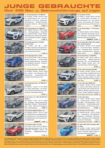 45. Kia Stonic Vision 1.0T-GDIEZ:11/2022, 74 kW / 101 PS, 27.900 km,Audio-Navigationssystem KIA (8 Zoll),DAB-Radio, LM-Felgen, Lenkrad- undSitzheizung, M%u00fcdigkeitserkennungsSensor17.790,- %u20ac46. Kia XCeed 1.6T DCTEZ: 03/2021, 150 kW / 204 PS, 105.500km, Exclusive-Paket, Navi-Paket, BiLED-Scheinwerfer, Sitz- und Lenkradheizung, Sound-System JBL Premium,Freisprecheinrichtung, elektrische Heckklappe 18.990,- %u20ac47. Kia XCeed Edition 7 1.0T EmotionPaketEZ: 10/2024, 88 kW / 120 PS, 9.000 km,LED- Tagfahrlicht, Klimaanlage, Tempomat, Dachspoiler, FreisprecheinrichtungBluetooth, Berganfahr-Assistent25.835,- %u20ac 20.990,- %u20ac48. Kia XCeed Spirit PHEV h%u00f6her gelegt,AHK, TotwinkelassistentEZ: 05/2021, 104 kW / 141 PS, 59.600km, Sitz-Komfort-Paket, R%u00fcckfahrkamera, Technologie-Paket, Fernlichtassistent, Totwinkelassistent, Klimaautomatik 2-Zonen 20.990,- %u20ac50. Kia e-Niro Inspiration 64,8 kWhEZ: 07/2023, 150 kW / 204 PS, 27.700km, Sound-Paket, DriveWise-Park-Plus,Relax-Paket, LED-Scheinwerfer, AppleCarPlay, SmartKey, Lenkrad- und Sitzheizung, Freisprecheinrichtung, Technologie-Paket 29.990,- %u20ac52. Kia e-Niro VisionEZ: 11/2021, 150 kW / 204 PS, 38.990km, Ladevorrichtung On-Board-Lader,LED-Paket, LED-Scheinwerfer, Fernlichtassistent, Verkehrszeichenerkennung, Lenkrad- und Sitzheizung, SmartKey, R%u00fcckfahrkamera 23.990,- %u20ac51. Kia e-Niro Spirit 64kWh 3PHEZ: 04/2022, 150 kW / 204 PS, 57.890km, Interieur-Color-Paket, Ladevorrichtung On-Board-Lader, Sitzheizung, Sitzbel%u00fcftung, Metallic-Lackierung Auroraschwarz, Schiebe-/Hebedach elektrisch,Sound-System JBL Premium 25.990,- %u20ac54. Abart 500C Cabrio Scorpione-/Winter-PaketEZ: 01/2024, 113 kW / 154 PS, 17.900km, Navigationssystem, 360%u00b0 R%u00fcckfahrkamera, Tempomat, Apple Carplay, Android Auto, Sportsitze, Alufelgen49.380,- %u20ac 31.990,- %u20ac37. Kia Sportage Spirit 1.6T AWD DCTEZ: 07/2024, 118 kW / 160 PS, 23.300km, R%u00fcckfahrkamera, Sitz- und Lenkradheizung, Smart-Key, Verkehrszeichenerkennung, Autobahn-Assistent,Berganfahr-Assistent, Klimaautomatik2-Zonen 31.890,- %u20ac38. Kia Sportage VIS 1.6T 2WD DCT7EZ: 12/2019, 130 kW / 177PS, 59.000km, Anh%u00e4ngerkupplung, Einparkhilfevorn, Klimaautomatik 2-Zonen, M%u00fcdigkeitserkennung, Verkehrszeichenerkennung, Berganfahr-Assistent, beheizbares Lenkrad 21.990,- %u20ac53. Kia Stonic 1.0T DCT VisionEZ: 02/2020, 88 kW / 120 PS, 92.700km, Servolenkung, LED-Tagfahrlicht,beheizbares Lederlenkrad, Klimaautomatik, Verglasung hinten abgedunkelt,Touchscreen-Farbdisplay, Kurvenbremskontrolle, Dachreling 14.990,- %u20ac39. Kia Sportage Vision 1.6 D AWDKomfort-PaketEZ: 11/2021, 100 kW / 136PS,59.350km, Sitzheizung, Navigationssystem, Multifunktionslenkrad, R%u00fcckfahrkamera, Freisprecheinrichtung21.990,- %u20ac40. Kia Sportage Vision 1.6 GDIEZ: 01/2019, 97 kW / 132PS, 55.350 km,Metallic-Lackierung, Komfort-Paket,Verkehrszeichenerkennung, Berganfahrund Bergabfahr-Assistent, Freisprecheinrichtung, Sitzheizung18.800,- %u20ac41. Kia Sportage Vision 1.6D 48V DCTEZ: 05/2024, 100 kW / 136 PS, 16.200km, Lenkrad- und Sitzheizung, LEDScheinwerfer, Freisprecheinrichtung,Alufelgen, R%u00fcckfahrkamera, Navi30.990,- %u20ac42. Kia Sportage Vision 1.6T AWD DCT7-AutomatikEZ: 08/2021, 130 kW / 177 PS, 38.990km, Allrad, Heckscheiben- und Sitzheizung, Verkehrszeichenerkennung, StauAssistent, Freisprecheinrichtung24.990,- %u20ac43. Kia Stonic 1.0 T-GDI 100 OPF DCT7Edition 7EZ: 05/2023, 74 kW / 101 PS, 14.900km, LM-Felgen, Freisprecheinrichtung,Berganfahr-Assistent, Touchscreendisplay, Klima, W%u00e4rmeschutzverglasung,Sitz- und Lenkradhzg. 19.990,- %u20ac44. Kia Stonic Nightline Edition 1.0TEZ: 05/2024, 88 kW / 120 PS, 15.500km, R%u00fcckfahrkamera, Schaltpunktanzeige, Sitzheizung vorn, LED-Scheinwerfer,Frontkollisionswarnung, Verglasung hinten abgedunkelt28.980,- %u20ac 22.990,- %u20ac49. Kia XCeed Vision 1.6 GDI PHEVEZ:12/2022, 77kW / 105 PS, 2.900 km,Komfort-Paket, Metallic-Lackierung,Navi-Paket, Sitz- und Lenkradheizung,Apple Carplay/ Android Auto, Freisprecheinrichtung, LED Scheinwerfer23.990,- %u20acJUNGE GEBRAUCHTE%u00dcber 500 Neu- u. Gebrauchtfahrzeuge auf LagerDie angegebenen Werte wurden nach dem vorgeschriebenen Messverfahren (%u00a7 2 Nrn. 5, 6, 6a Pkw-EnVKV in der jeweils geltenden Fassung) ermittelt. Irrt%u00fcmer und Vorverkauf vorbehalten %u2013 *MwSt. ausweisbar! Weitere Informationen zum offiziellen Kraftstoffverbrauch und den offiziellen spezifischen CO2-Emissionen neuer Personenkraftwagen k%u00f6nnen dem %u201eLeitfaden %u00fcber den Kraftstoffverbrauch, die CO2-Emissionen und den Stromverbrauch neuer Personenkraftwagen%u201c entnommen werden, der anallen Verkaufsstellen und bei der DAT Deutsche Automobil Treuhand GmbH, Hellmuth-Hirth-Stra%u00dfe 1, 73760 Ostfildern (www.dat.de), unentgeltlich erh%u00e4ltlich ist. Die tats%u00e4chliche Reichweite kann aufgrund zahlreicher Faktoren wie Fahrstil, Route, Wetter und Stra%u00dfenbedingungen sowie Zustand, Gebrauch, und Ausstattung des Fahrzeugs variieren.