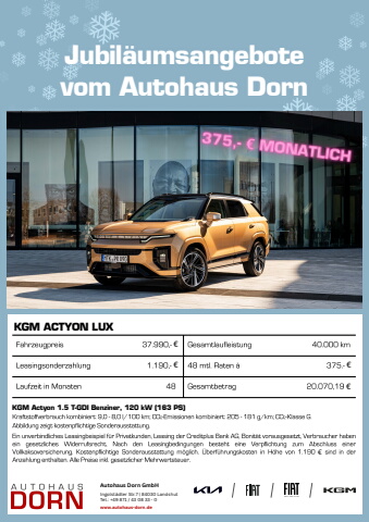 Jubil%u00e4umsangebotevom Autohaus DornAutohaus Dorn GmbHIngolst%u00e4dter Str.7 | 84030 LandshutTel.: +49 871 / 43 08 33 - 0www.autohaus-dorn.deKGM ACTYON LUXFahrzeugpreis 37.990,- %u20ac Gesamtlaufleistung 40.000 kmLeasingsonderzahlung 1.190,- %u20ac 48 mtl. Raten %u00e0 375.- %u20acLaufzeit in Monaten 48 Gesamtbetrag 20.070,19 %u20acKGM Actyon 1.5 T-GDI Benziner, 120 kW (163 PS)Kraftstoffverbrauch kombiniert: 9,0 - 8,0 l/100 km; CO2-Emissionen kombiniert: 205 - 181 g/km; CO2-Klasse G.Abbildung zeigt kostenpflichtige Sonderausstattung.Ein unverbindliches Leasingbeispiel f%u00fcr Privatkunden, Leasing der Creditplus Bank AG, Bonit%u00e4t vorausgesetzt, Verbraucher habenein gesetzliches Widerrufsrecht, Nach den Leasingbedingungen besteht eine Verpflichtung zum Abschluss einerVollkaksoversicherung. Kostenpflichtige Sonderausstattung m%u00f6glich. %u00dcberf%u00fchrungskosten in H%u00f6he von 1.190 %u20ac sind in derAnzahlung enthalten. Alle Preise inkl. gesetzlicher Mehrwertsteuer.