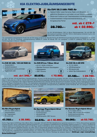 Kia Niro Plug-in-HybridVFW 04/2025, 9.000 kmAusparkassistentSpurfolgeassistentKlimaautimatik47.750 .- %u20ac 35.590,-Kia Sorento Plug-in-Hybrid AllradEZ 10/2025, 500 km7-Sitzer, 360%u00b0 Kamera, SpurassistentVerkehrszeichenerkennungVoll-LED-Scheinwerfer66.060.- ab 53.790.-Kia Niro Plug-in Hybrid 1.6 GDI Plug-in Hybrid (Benzin/Strom/Automatik); 132,4 kW (180 PS): Kraftstoffverbrauch gewichtet kombiniert 2,7 l/100 km; Stromverbrauch gewichtetkombiniert 8,3 kWh/100 km; CO%u2082-Emissionen gewichtet kombiniert 61 g/km. CO%u2082-Klasse B. Kraftstoffverbrauch bei entladener Batterie kombiniert 5,1 l/100 km. CO%u2082-Klasse beientladener Batterie D. Kia Sportage Plug-in Hybrid 1.6 T-GDI Plug-in Hybrid AT AWD (Benzin/Strom/Automatik); 185 kW (252 PS): Kraftstoffverbrauch gewichtet kombiniert 1,2l/100 km; Stromverbrauch gewichtet kombiniert 18,7 kWh/100 km; CO%u2082-Emissionen gewichtet kombiniert 28 g/km. CO%u2082-Klasse B. Kraftstoffverbrauch bei entladener Batteriekombiniert 6,9 l/100 km. CO%u2082-Klasse bei entladener Batterie F. Kia Sorento Plug-in Hybrid (7-Sitzer) 1.6 T-GDI Plug-in Hybrid AT AWD 7-Sitzer Platinum (Benzin/Strom/Automatik);185 kW (252 PS): Kraftstoffverbrauch gewichtet kombiniert 1,6 l/100 km; Stromverbrauch gewichtet kombiniert 18,2 kWh/100 km; CO%u2082-Emissionen gewichtet kombiniert 37g/km. CO%u2082-Klasse B. Kraftstoffverbrauch bei entladener Batterie kombiniert 7,6 l/100 km. CO%u2082-Klasse bei entladener Batterie F. Abbildungen zeigen kostenpflichtigeSonderausstattungen.Kia Sportage Plug-in-Hybrid AllradEZ 08/2025, 3.500 kmFernlichtassistentKlimaautomatikLED-Scheinwerfer, 360%u00b0 Kamera50.870.- ab %u20ac 40.990,-Kia EV6 63 kWh, 125 kW RWD AirInsassenalarmAutobahnassistentParksensoren vorne und hintenTagfahrlicht- LEDmtl. ab %u20ac 340,-%u00b3Kia EV3 58.3 AIR STDTZ 10/2025LED-ScheinwerferKlimaautomatikaktiver Spurhalteassistent37.180.- %u20ac 29.790,-Kia EV9 GT-Line 7-Sitzer AllradEZ 07/2025, 2.500 kmMeridian Premoium SoundsystemMassagesitze360%u00b0 Kamera83.670.- %u20ac 70.990,-Kia EV4 58.3 kWh FWD AirHightech-Helfer nutzen Kameras, Radar und Ultraschall, umgef%u00e4hrliche Situationen zu vermeiden und den Fahrer zu entlasten.Modernste Funktionen wie Totwinkelassistent mit MonitoranzeigeAutobahnassistent mit Spurwechselunterst%u00fctzung undferngesteuertes Parkenmtl. ab %u20ac 279.-%u00b238.780.- ab %u20ac 32.990,-%u00b2 Ein unverbindliches Leasingbeispiel f%u00fcr Privatkunden der KIA Leasing, ein Service der Allane SE, Parkring 33, 85748 Garching bei M%u00fcnchen Bonit%u00e4t vorausgesetzt f%u00fcr den Kia EV458 kWh 150 kW Air Frontantrieb, Leasingsonderzahlung 3.990,00 %u20ac, Laufzeit 48 Monate, 48%u00d7 mtl. Leasingrate %u00e0 279,00 %u20ac, Laufleistung 5.000 km/Jahr, zzgl.%u00dcberf%u00fchrungskosten in H%u00f6he von 1.190,00 %u20ac.Kia EV6 Air, 63 kWh, 125 kW RWD (Strom/Reduktionsgetriebe); 125 kW (170 PS): Stromverbrauch kombiniert 16,4 kWh/100 km, CO%u2082-Emissionen kombiniert 0 g/km; CO%u2082-Klasse A. Reichweite bis zu 428 km. Kia EV9 AWD GT-Line (Strom/Reduktionsgetriebe); 283 kW (385 PS): Stromverbrauch kombiniert 22,8 kWh/100 km; CO%u2082-Emissionenkombiniert 0 g/km; CO%u2082-Klasse A. Bis zu 505 km Reichweite, KIA EV3 Elektromotor (150 kW/204 PS):, Stromverbrauch kombiniert 16,2 kWh/100 km, CO%u2082-Emissionen kombiniert0 g/km, CO%u2082-Klasse A. Reichweite bis zu 436 km: %u00b3 Ein unverbindliches Leasingbeispiel f%u00fcr Privatkunden der KIA Leasing, ein Service der Allane SE, Parkring 33, 85748 Garching beiM%u00fcnchen Bonit%u00e4t vorausgesetzt f%u00fcr den Kia EV6 63 kWh 125 kW Air Heckantrieb, Leasingsonderzahlung 4.990,00 %u20ac, Laufzeit 48 Monate, 48%u00d7 mtl. Leasingrate %u00e0 240,00 %u20ac,Laufleistung 5.000 km/Jahr, zzgl. %u00dcberf%u00fchrungskosten in H%u00f6he von 1.190,00 %u20ac.KIA ELEKTRO-JUBIL%u00c4UMSANGEBOTEKia EV4 58.3-kWh-Batterie, FWD Air (Strom/Reduktionsgetriebe); 150 kW (204 PS):Stromverbrauch kombiniert 14,9 kWh/100 km; CO%u2082-Emissionen kombiniert 0 g/km; CO%u2082-Klasse A. Bis zu 440 km Reichweite..