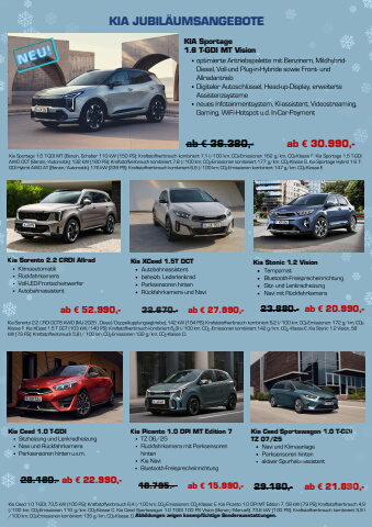 Kia Sorento 2.2 CRDI AllradKlimaautomatikR%u00fcckfahrkameraVoll-LED-FrontscheinwerferAutobahnassistentab %u20ac 52.990,-Kia Stonic 1.2 VisionTempomatBluetooth-FreisprecheinrichtungSitz- und LenkradheizungNavi mit R%u00fcckfahrkamera23.880.- ab %u20ac 20.990,-Kia Ceed 1.0 T-GDISitzheizung und LenkradheizungNavi und R%u00fcckfahrkameraParksensoren hinten u.v.m.28.180.- ab %u20ac 22.990,-Kia Ceed Sportswagon 1.0 T-GDITZ 07/25Navi und KlimaanlageParksensoren hintenaktiver Spurhalteassistent29.180,- ab %u20ac 21.890,-Kia XCeed 1.5T DCTAutobahnassistentbeheizb. LederlenkradParksensoren hintenR%u00fcckfahrkamera und Navi32.670.- ab %u20ac 27.990,-Kia Picanto 1.0 DPI MT Edition 7TZ 06/25R%u00fcckfahrkamera mit ParksensorenhintenKia NaviBluetooth-Freisprecheinrichtung18.795.- ab %u20ac 15.990,-KIA Sportage1.6 T-GDI MT Visionoptimierte Antriebspalette mit Benzinern, Mildhybrid- Diesel, Voll-und Plug-in-Hybride sowie Front- undAllradantriebDigitaler Autoschl%u00fcssel, Head-up-Display, erweiterteAssistenzsystemeneues Infotainmentsystem, KI-assistent, Videostreaming,Gaming, WiFi-Hotspot u.d. In-Car-Paymentab %u20ac 36.380,- ab %u20ac 30.990,-Kia Sportage 1.6 T-GDI MT (Benzin, Schalter 110 kW (150 PS): Kraftstoffverbrauch kombiniert 7,1 l/100 km; CO%u2082-Emissionen 162 g/km, CO%u2082-Klasse F. Kia Sportage 1.6 T-GDIAWD DCT (Benzin/Automatik); 132 kW (180 PS): Kraftstoffverbrauch kombiniert 7,8 l/100 km; CO%u2082-Emissionen kombiniert 177 g/km. CO%u2082-Klasse G. Kia Sportage Hybrid 1.6 TGDI Hybrid AWD AT (Benzin/Automatik); 176 kW (239 PS): Kraftstoffverbrauch kombiniert 6,5 l/100 km; CO%u2082-Emissionen kombiniert 147 g/km. CO%u2082-Klasse EKIA JUBIL%u00c4UMSANGEBOTEKia Sorento 2.2 CRDI DCT8 AWD (MJ 2025 , Diesel/Doppelkupplungsegtriebe); 142 kW (194 PS): Krafststoffverbrauch kombiniert 6,2 l/100 km; CO%u2082-Emissionen: 172 g/km; CO%u2082-Klasse F. Kia XCeed 1.5 T DCT (103 kW/140 PS): Kraftstoffverbrauch kombiniert 6%u20823l l/100 km. CO%u2082 -Emissionen kombiniert 142 g/km. CO%u2082 -Klasse E. Kia Stonic 1.2 Vision, 58kW (79 PS): Kraftstoffverbrauch 5,8 l/ 100 km, CO%u2082-Emissionen 132 g/km; CO%u2082-Klasse: D.Kia Ceed 1.0 T-GDI, 73,5 kW (100 PS): Kraftstoffverbrauch 6,4 l/100 km; CO%u2082-Emissionen; CO%u2082-Klasse: E. Kia Picanto 1.0 DPI MT Edition 7, 58 kW (79 PS); Kraftstoffverbrauch 4,9l/100 km; CO%u2082-Emissionen 110 g/km; CO%u2082-Klasse C. Kia Ceed Sportswagon 1.0 T-GDI 100 PS Vision (Benzin/Manuell); 73,6 kW (100 PS): Kraftstoffverbrauch kombiniert 5,9 l/100 km; CO%u2082-Emissionen kombiniert 135 g/km, CO%u2082-Klasse: D. Abbildungen zeigen kosenpflichtige Sonderausstattungen.